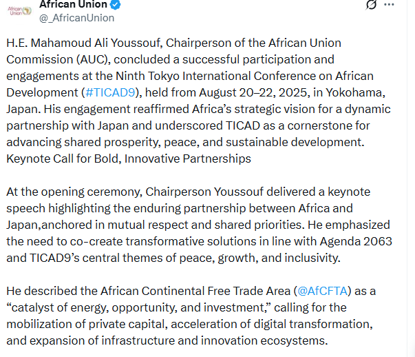 Delivering a keynote address at the TICAD9 opening ceremony, Youssouf underscored Africa’s commitment to Agenda 2063 and highlighted the African Continental Free Trade Area (AfCFTA) as a “catalyst of energy, opportunity, and investment.”