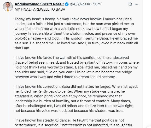 “Today, my heart is heavy in a way I have never known. I mourn not just a leader, but a father. Not just a statesman, but the man who picked me up when life had left me with a void I did not know how to fill,” he wrote.