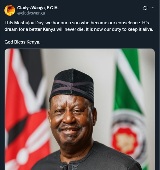 “This Mashujaa Day, we honour a son who became our conscience. His dream for a better Kenya will never die. It is now our duty to keep it alive. God Bless Kenya,” Wanga wrote.
