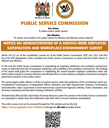 “The findings of the survey shall guide the Commission in establishing the overall baseline employee satisfaction index and inform policy reviews to improve efficiency and effectiveness in service delivery, workplace environment and good governance practices in the public service,” the notice read in part.
