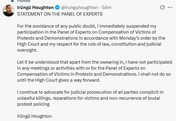“For the avoidance of any public doubt, I immediately suspended my participation in the Panel of Experts on Compensation of Victims of Protests and Demonstrations in accordance with Monday’s order by the High Court and my respect for the rule of law, constitution and judicial oversight,” he said.
