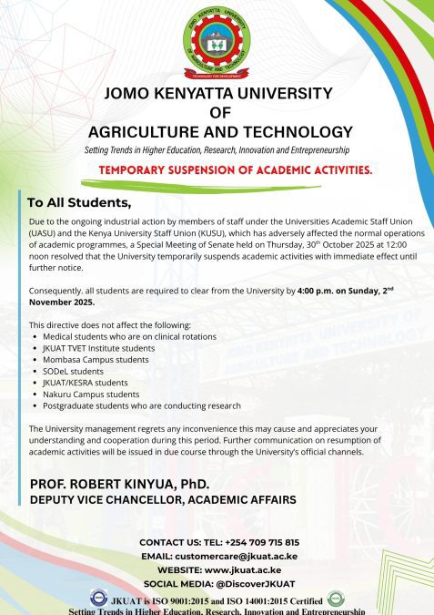 Jomo Kenyatta University of Agriculture and Technology (JKUAT) has directed all students to vacate its campuses within the next 24 hours, by 4:00 p.m. on Sunday, November 2, 2025, following a disruption in academic activities caused by ongoing lecturers’ strikes.