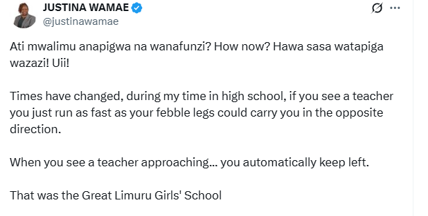 “Times have really changed. During my time in high school, if you saw a teacher, you just ran as fast as your feeble legs could carry you in the opposite direction. When you saw a teacher approaching, you automatically kept to the left. That was the Great Limuru Girls’ School,” Wamae wrote.