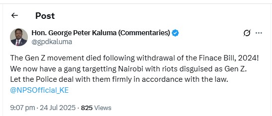“The Gen Z movement died following the withdrawal of the Finance Bill, 2024! We now have a gang targeting Nairobi with riots disguised as Gen Z. Let the Police deal with them firmly in accordance with the law,” Kaluma said.