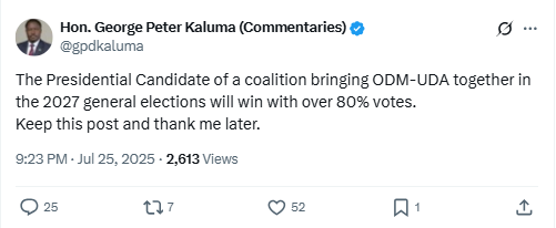 Taking to his official X account on Friday, July 25, 2025, Kaluma confidently declared that the ODM-UDA coalition candidate would clinch the presidency with over 80% of the vote.