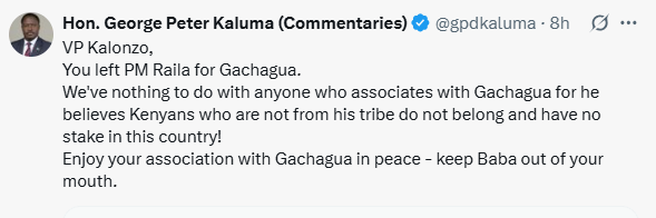 “VP Kalonzo, you left PM Raila for Gachagua. We’ve nothing to do with anyone who associates with Gachagua, for he believes Kenyans who are not from his tribe do not belong and have no stake in this country. Enjoy your association with Gachagua in peace – keep Baba out of your mouth,” Kaluma said.