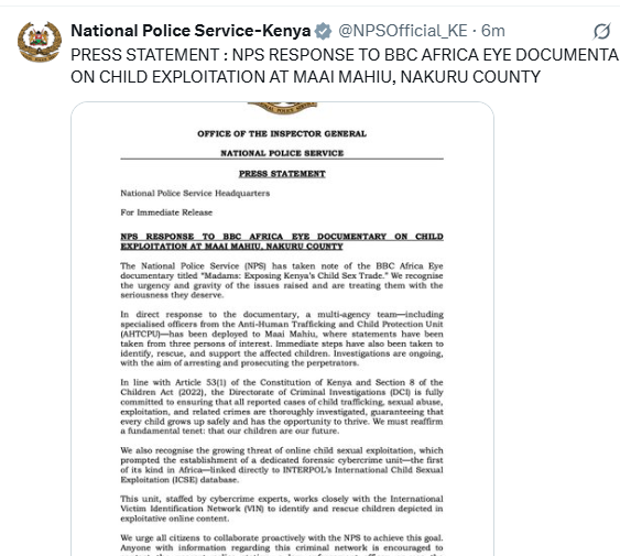 The National Police Service (NPS) has responded promptly to the BBC Africa Eye documentary, acknowledging the seriousness of the issues raised about child exploitation in Maai Mahiu, Nakuru County.