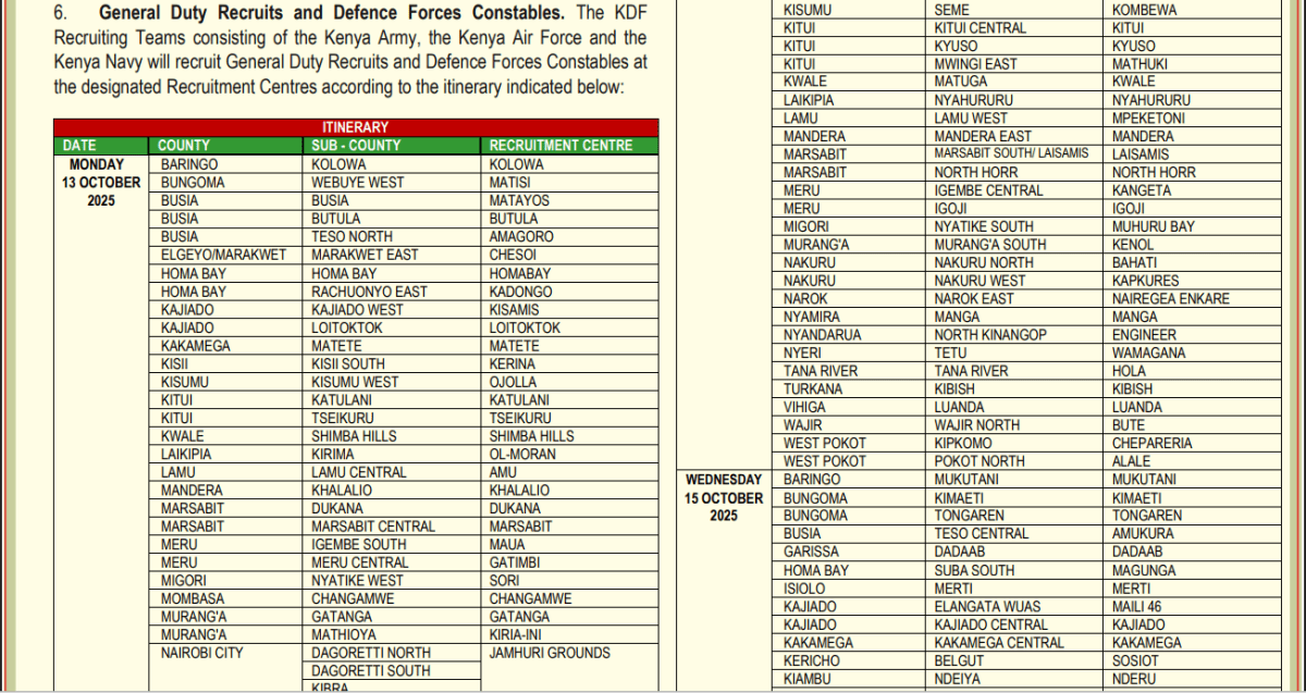 The recruitment process will continue daily through Saturday, October 25, 2025, rotating across all counties, including Baringo, Bomet, Bungoma, Embu, Garissa, Homa Bay, Isiolo, Kajiado, Kakamega, Kericho, Kiambu, Kilifi, Kirinyaga, Kisii, Kisumu, Kitui, Laikipia, Machakos, Makueni, Mandera, Marsabit, Meru, Migori, Mombasa, Murang’a, Nakuru, Nandi, Narok, Nyeri, Siaya, Taita Taveta, Tharaka-Nithi, Trans-Nzoia, Turkana, Uasin Gishu, Vihiga, and Wajir.