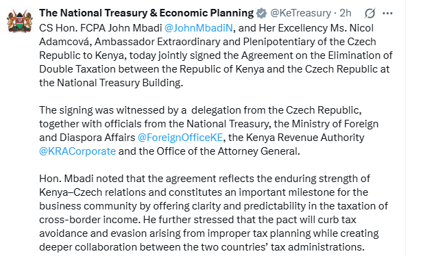 “CS Hon. John Mbadi and Her Excellency Ms Nicol Adamcová, Ambassador Extraordinary and Plenipotentiary, held a signing ceremony of the agreement for the elimination of double taxation between the Republic of Kenya and the Czech Republic at the Treasury building,” the X post read in part.