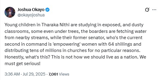 “Young children in Tharaka Nithi are studying in exposed and dusty classrooms, some even under trees. The boarders are fetching water from nearby streams, while their former senator, who’s the current second in command is ’empowering’ women with 64 shillings and distributing tens of millions in churches for no particular reasons. Honestly, what’s this? This is not how we should live as a nation. We must get serious,” he said.