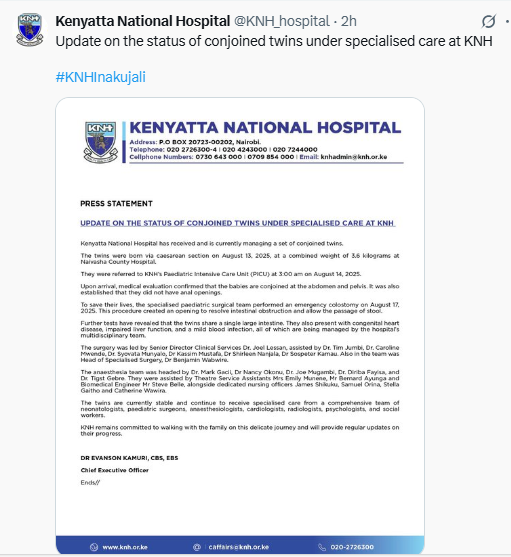 Kenyatta National Hospital (KNH) has issued an update on a rare case involving conjoined twins born at Nawasha County Hospital on August 13, 2025.