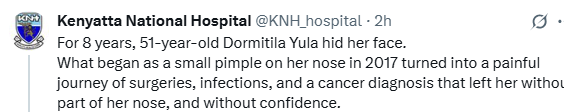 “I can finally face the world,” she said. Her story is a powerful reminder of resilience, innovation, transformation, hope, and proof that at KNH,” the hospital posted on its X account on Tuesday, October 28, 2025.