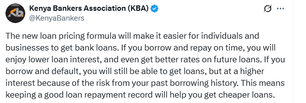 The Kenya Bankers Association (KBA) has issued a new directive to loan defaulters following the new revised risk-based credit pricing model by the Central Bank of Kenya (CBK).
