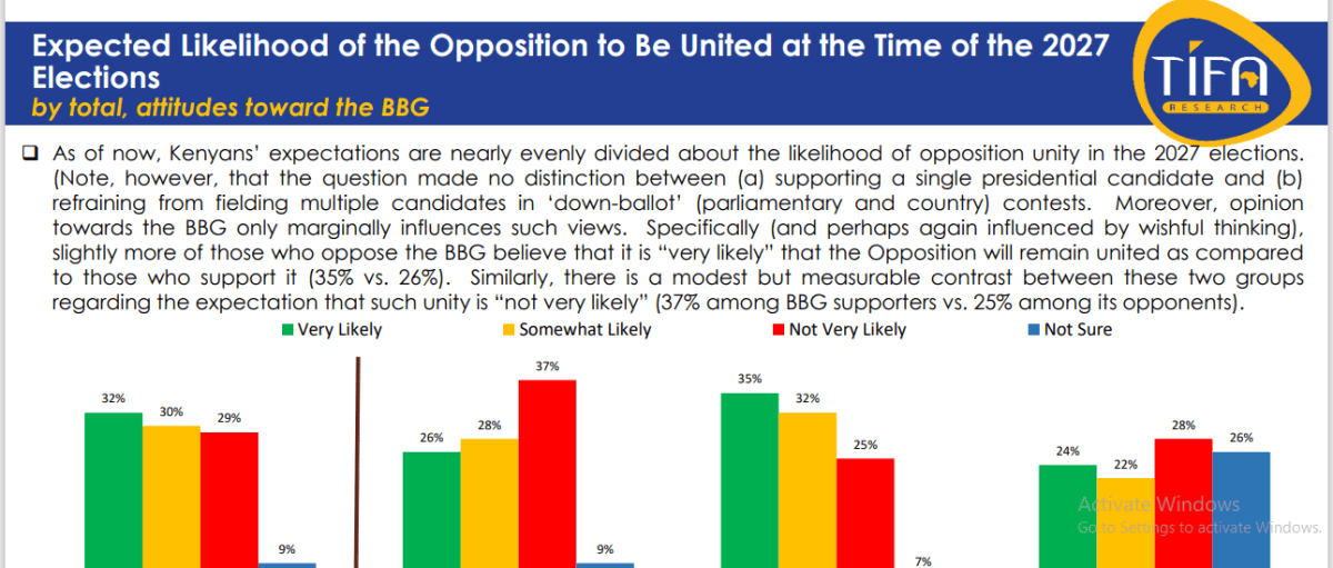 The majority of Kenyans believe the opposition will remain united as the country heads toward the 2027 elections, according to the latest TIFA survey.