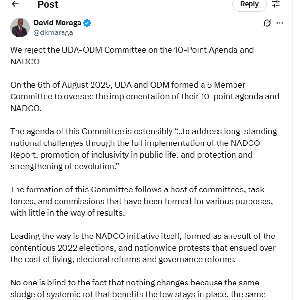 On August 6, 2025, the ruling UDA and opposition ODM established a five-member committee to oversee the implementation of the 10-Point Agenda and the National Dialogue and Cohesion (NADCO) report.