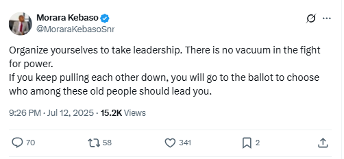 “Organise yourselves to take leadership. There is no vacuum in the fight for power. If you keep pulling each other down, you will go to the ballot to choose who among these old people should lead you,” Kebaso wrote, striking a chord with a younger generation that has increasingly demanded change.