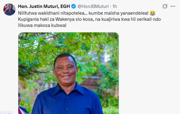 “Nilifutwa wakidhani nitapotelea… kumbe maisha yanaendelea! Kupigania haki za Wakenya sio kosa, na kuajiriwa kwa hii serikali ndo ilikuwa makosa kubwa,” Muturi wrote.