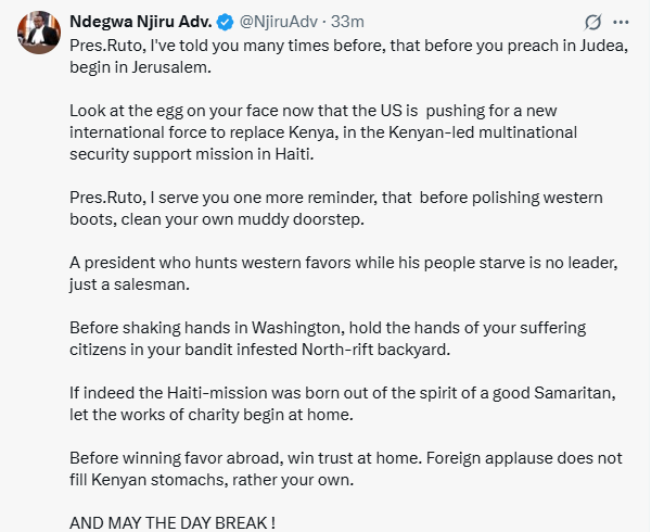 Outspoken advocate and human rights activist Ndegwa Njiru has scoffed at President William Ruto following reports that the United States is reconsidering Kenya’s role in leading the multinational security mission in Haiti.