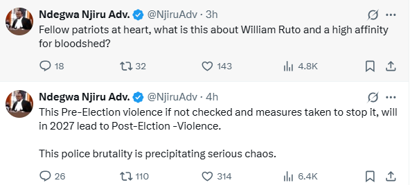 “This pre-election violence, if not checked and measures taken to stop it, will in 2027 lead to post-election violence. This police brutality is precipitating serious chaos,” Ndegwa warned.