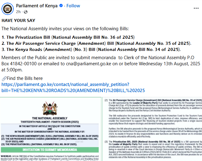 According to the notice, the views on the bill are to be submitted to the Public Debt and Privatisation Committee on or before Wednesday, 13th August 2025, at 5.00 pm.