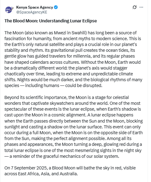The Kenya Space Agency has announced that on the night of September 7, 2025, people in Kenya and many other places will see a Blood Moon, a red-colored moon in the sky.