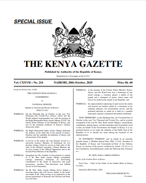 The award, given under the public seal of the Republic of Kenya, came as the country continues to observe seven days of mourning following Raila’s death earlier this month.