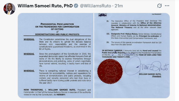 President William Ruto has announced the establishment of a special framework to compensate victims of demonstrations and public protests, including civilians and security officers who lost their lives or suffered injuries since 2017.