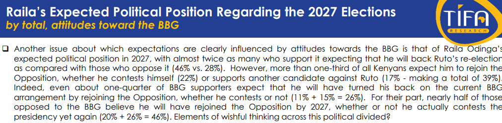 “Another issue about which expectations are clearly influenced by attitudes towards the BBG is that of Raila Odinga’s expected political position in 2027, with almost twice as many who support it expecting that he will back Ruto’s re-election as compared with those who oppose it (46% vs. 28%),” the poll reads.