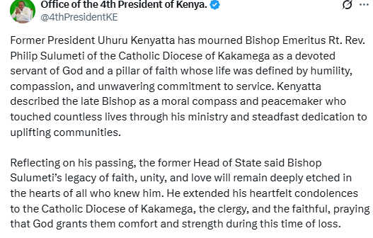 Former President Uhuru Kenyatta has joined the Catholic faithful and Kenyans at large in mourning the passing of Bishop Emeritus Rt. Rev. Philip Sulumeti of the Catholic Diocese of Kakamega who died on Sunday night, November 9, 2025.