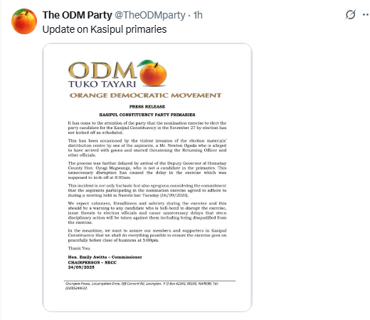 ODM party highlighted the party’s commitment to ensuring a free, fair, and orderly process, even as local political tensions remain high.