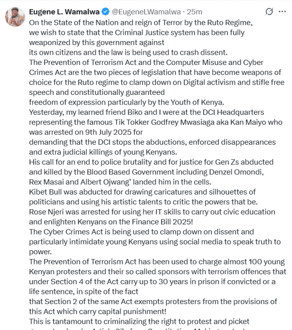 In a detailed statement shared on X dated July 22, 2025, Wamalwa said the government has turned to the Prevention of Terrorism Act and the Computer Misuse and Cyber Crimes Act to target young Kenyans who are increasingly vocal about police brutality, enforced disappearances, and controversial government policies such as the Finance Bill 2025.