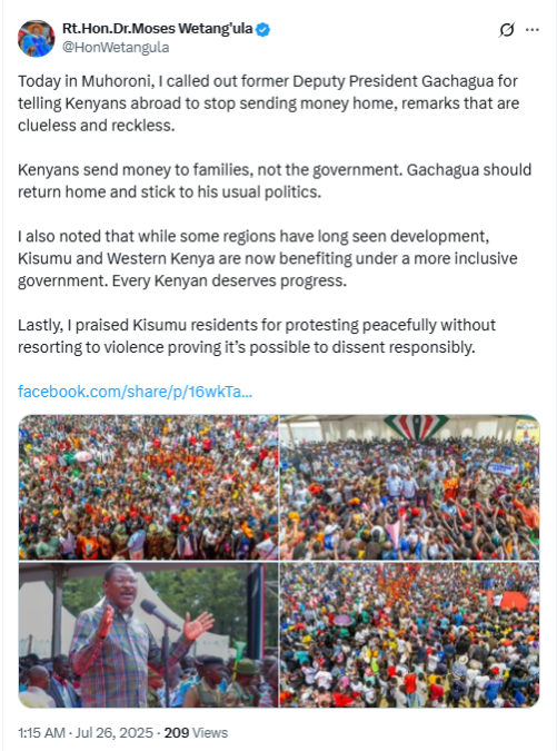 “Today in Muhoroni, I called out former Deputy President Gachagua for telling Kenyans abroad to stop sending money home, remarks that are clueless and reckless. Kenyans send money to families, not the government. Gachagua should return home and stick to his usual politics,” Wetang’ula stated.