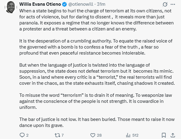 In a strongly worded statement on his X account on Monday, July 21, 2025, Otieno accused the state of weaponising the law against its citizens, warning that branding peaceful protesters as terrorists marked a disturbing erosion of justice and democratic principles.